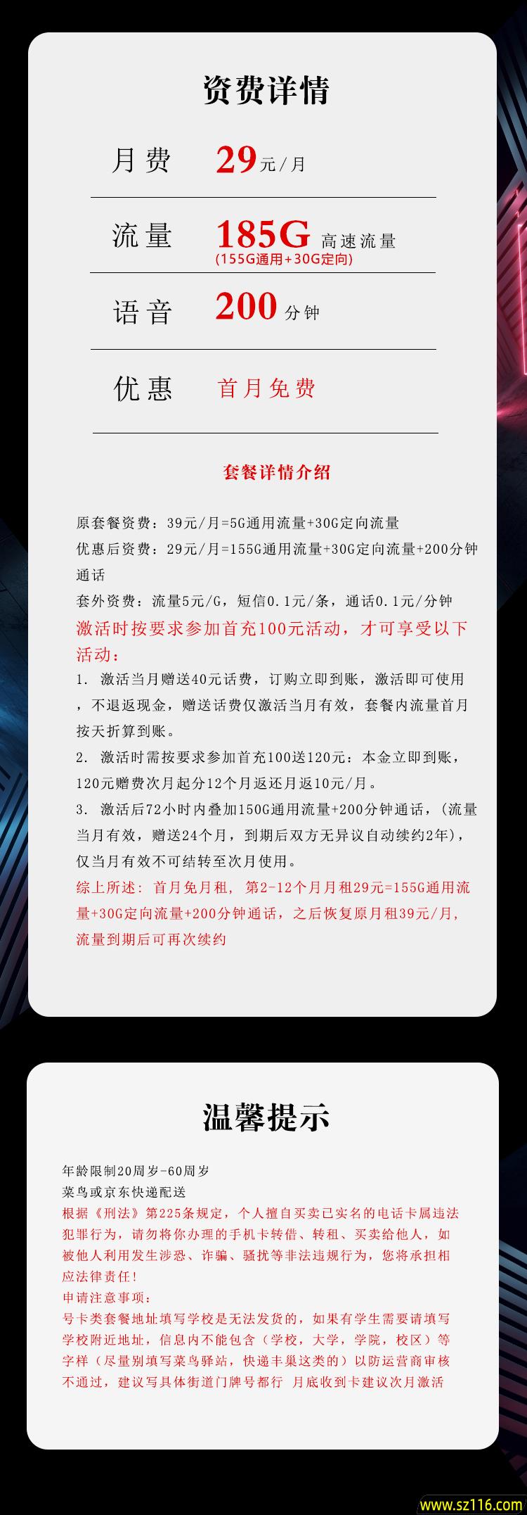 温馨提示:号卡资料可能会随运营商政策而变动,具体资料以下单页为准,此页面仅供展示,非下单页面。