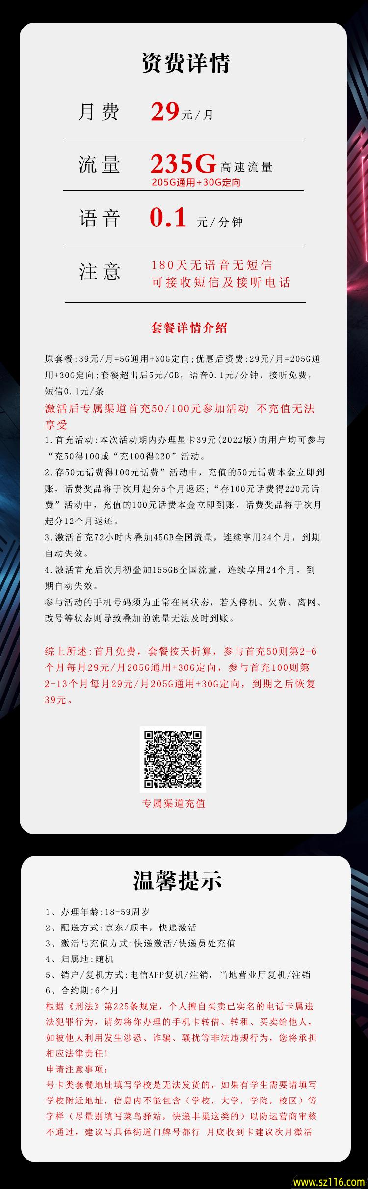 温馨提示:号卡资料可能会随运营商政策而变动,具体资料以下单页为准,此页面仅供展示,非下单页面。