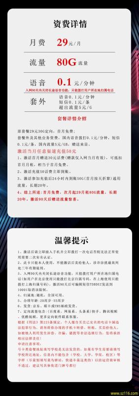 温馨提示:号卡资料可能会随运营商政策而变动,具体资料以下单页为准,此页面仅供展示,非下单页面。