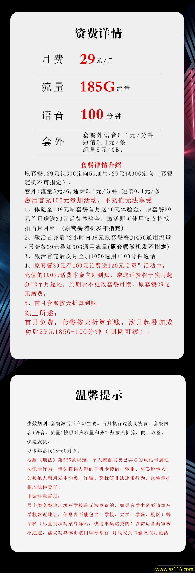 温馨提示:号卡资料可能会随运营商政策而变动,具体资料以下单页为准,此页面仅供展示,非下单页面。