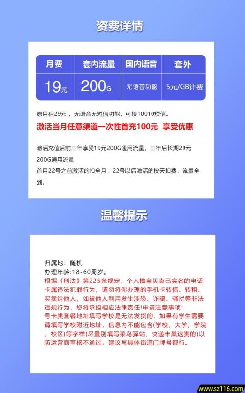温馨提示:号卡资料可能会随运营商政策而变动,具体资料以下单页为准,此页面仅供展示,非下单页面。