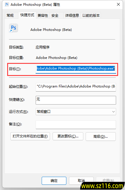 1、桌面的ps图标上右键单击,弹出的对话框中单击属性