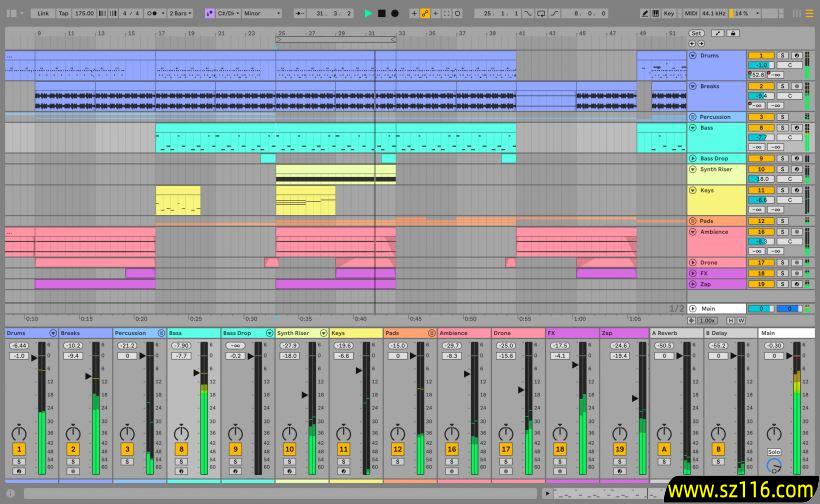 调音台改进 – Live 的调音台现在不仅可以在 Session 界面中使用,还能在 Arrangement 界面中使用。调音台本身也进行了改进,显示更加精细和准确,并增强了易读性和可控性。