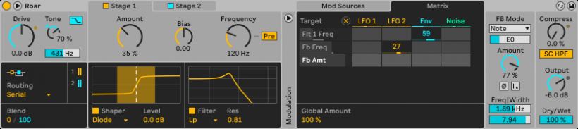 Roar – 利用 Live 全新的染色与饱和算法,从细微的温暖感到狂野的过载效果,Roar 都能轻松驾驭。其中三个饱和度处理器可以串联或平行调用,甚至以 mid/side 通道进行使用 – 所有参数均能够用扩展调制矩阵进行控制。