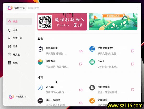 点击搜索框右侧 rubick 图标,进入插件市场,选择所需插件,点击下载按钮即可下载,下载完成后在已安装 tab 下可以找到安装插件。 安装完成后,输入插件呼起命令即可使用对应插件。