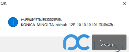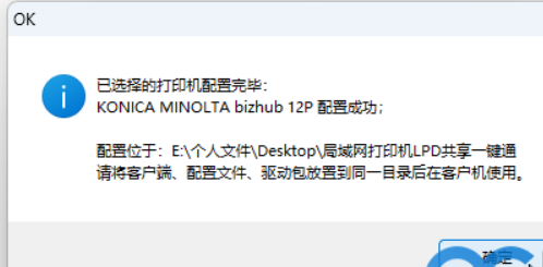 打印机配置完毕,当前目录生成 驱动文件夹 KONICA MINOLTA bizhub 12P 和 配置文件 Server_Printer_Config_KONICA_MINOLTA_bizhub_12P.ini,点击 确定
