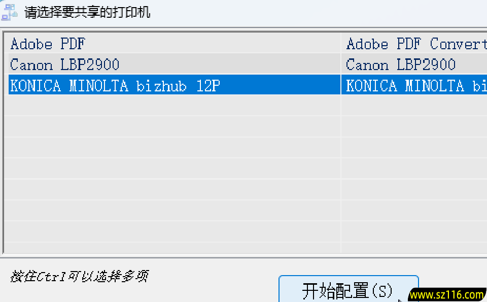 选择要共享的打印机,本例为 KONICA MINOLTA(柯尼卡美能达) bizhub 12P,点击 开始配置