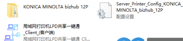 拷贝服务端生成的驱动文件夹 KONICA MINOLTA bizhub 12P 和 配置文件Server_Printer_Config_KONICA_MINOLTA_bizhub_12P.ini 到客户端,双击 局域网打印机LPD共享一键通(客户端)可执行程序