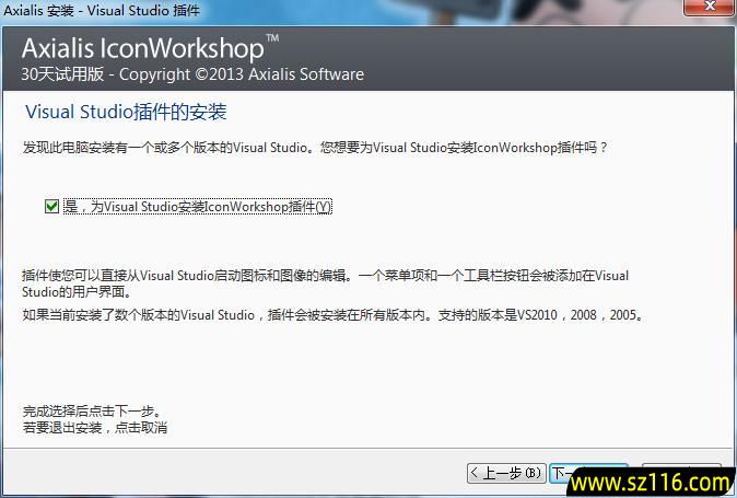 4、选择Visual Studio插件的安装,用户可自主选择是否安装此插件,该插件可使您可直接从Visual Studio启动图标和图像的编辑,一个菜单项和一个工具栏按钮会被添加在Visual Studio的用户界面,如果用户选择此插件的安装,插件会被安装再所有版本内,支持的版本包括VS2010/2008个2005