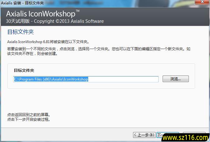 5、选择IconWorkshop的目标文件夹,默认路径为C:\Program Files (x86)\Axialis\IconWorkshop,若用户想要安装到一个不同的文件夹,可点击浏览选择另一个文件夹,用户可以在下面的编辑区指定一个新文件夹,如果文件夹不存在则会被创建,或可直接默认点击下一步安装