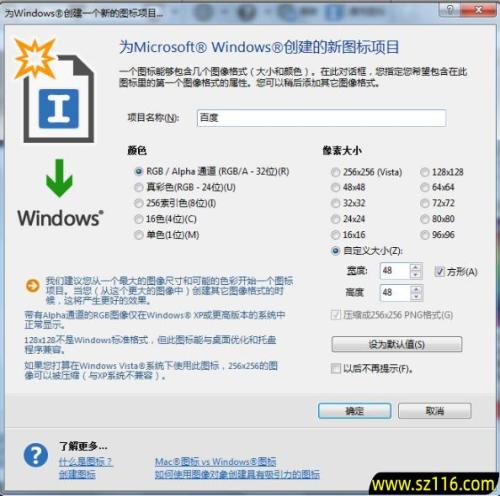2.在选择颜色要勾选为RGB/Alpha通道,像素大小选择自定义但是最好小于128×128,因为这样出来的效果可能最好,然后点击“确定”(在窗口的左下角有提示,要注意一下,这款图标制作软件的每个窗口都有类似的提示)