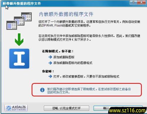 这是因为我们打开了一个内嵌额外数据的项目,在这类可执行文件中添加或移除突变可能导致文件永久性损坏,因此,我强烈建议各位以限制模式打开这类文件