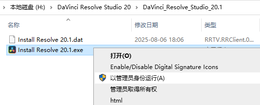 1、鼠标右击【Install Resolve 20.1.exe】选择【以管理员身份运行】。