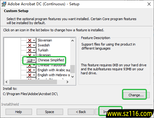 4、语言检查(检查简体中文是否选择)及安装位置更改,点击【Change】更换安装位置(注意:更改位置不能带中文或特殊符号),然后点击【Install】。