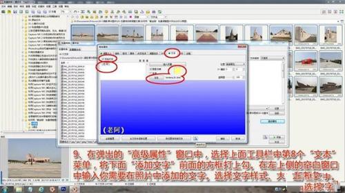 9、在弹出的“高级属性”窗口中,选择上面工具栏中第8个“文本”菜单,将下面“添加文字”前面的方框打上勾。在左上侧的空白窗口中输入你需要在照片中添加的文字。选择文字样式、大小和颜色。