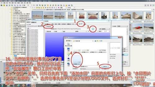 16、当然如果我们事先设计了自己的水印LOGO,我们也可以选择“高级属性”窗口工具栏中第9个“水印”菜单。同样首先将下面“添加水印”前面的方框打上勾。按“水印图片文件”右侧的“…”选择你事先在PS里设计好的LOGO文件。选择好后按“打开”按钮。