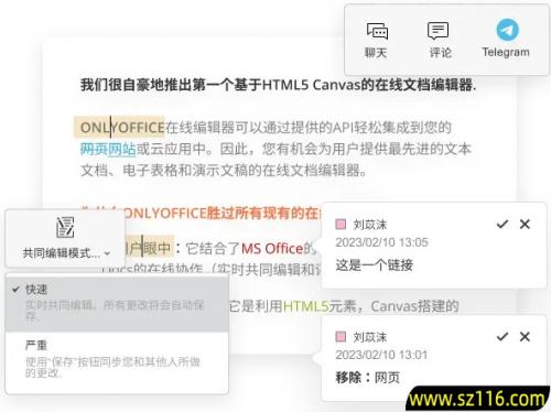 与您的团队在线协作处理文档:选择适合的共同编辑模式——在键入时快速显示所有更改,或者仅严格显示保存后的更改。留下并分类批注评论,并在内置聊天或Telegram中讨论该流程。使用追踪修订模式和预览功能了解在接受或拒绝更改后的文档外观。