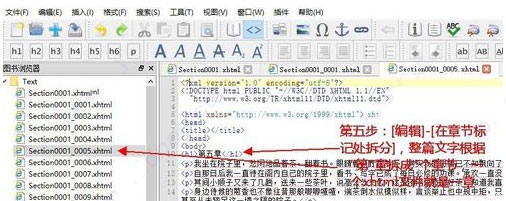 6、编辑-在章节标记处拆分。整编文字会根据第*章/节自动拆分成n个章节,一个XHTML文件就是一个章节。