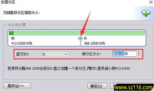 2、进入创建分区窗口,首先可以用鼠标左键点击两个新盘符中间的箭头图标左右拖动来调整新分区的大小,或者可以直接从下方设置新盘符的名称和大小。