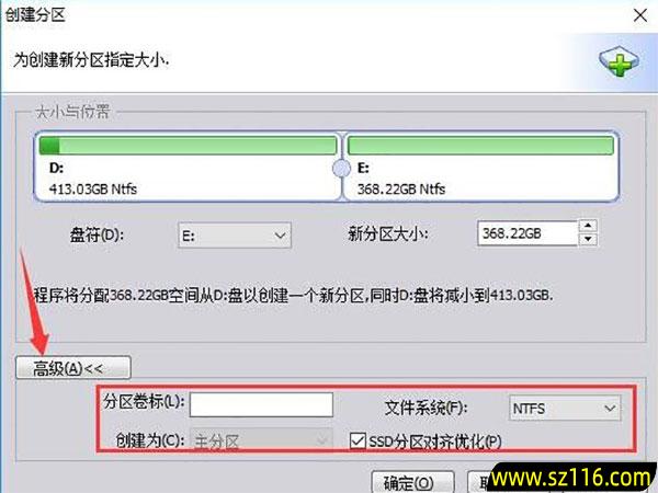 3、点击左下方的“高级”按钮,在高级设置中,可以选择新分区的卷标和文件系统。如果是SSD硬盘的话,最好勾选上“SSD分区对齐优化”选项。全部选定后,点击下方的“确定”按钮等待分区任务完成即可。