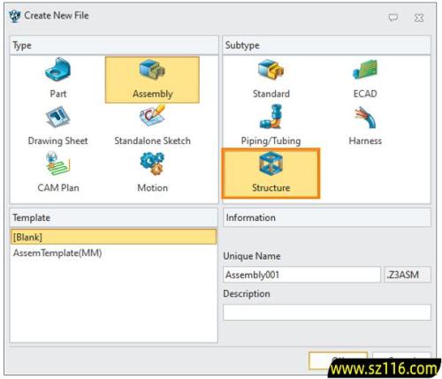 提供单独的结构件文件类型。在创建文件时,可选择装配 >> 结构件完成文件的创建。文件创建完成后,软件将直接进入到结构件设计模块,可开始下一步的结构件模型设计。