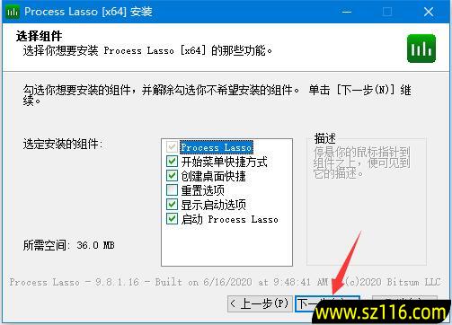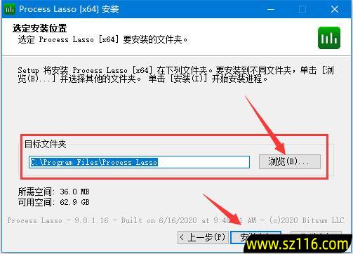 4.点击“浏览”选择软件安装目录,默认目录:C:\Program Files\Process Lasso;(不建议将此款软件安装在C盘,可以选择D盘等其他盘安装)如图